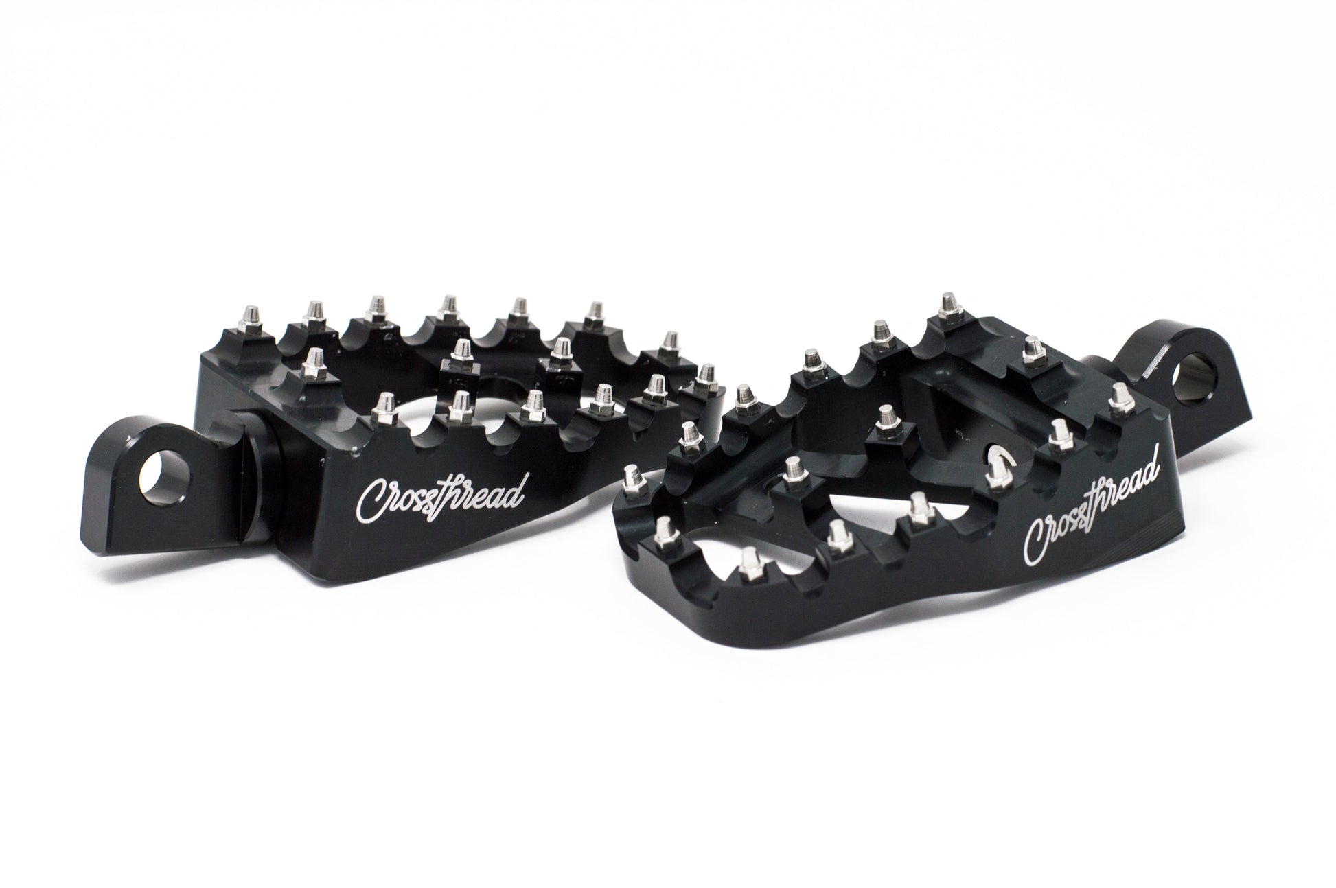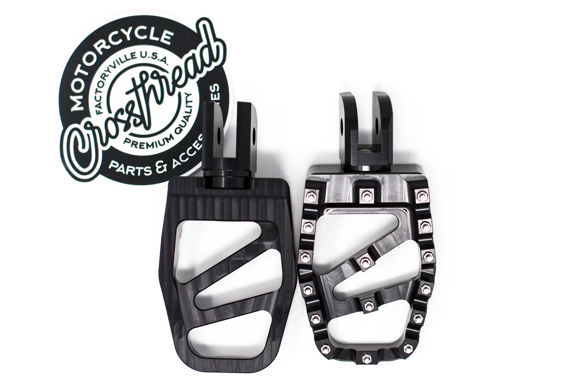 Our MX Pegs are made from 6061 T6 alloy aluminum by CNC machining. These materials are up to 50% Lighter than most stock foot pegs. Color anodizing surface treatment helps improve the corrosion resistance and gives a badass custom look. Full 360 degree foot peg rotation makes these foot pegs perfect for whatever riding style you prefer. The comfortable serrated foot surface area gives you a wider area for your feet and provide a good bite on the bottom of your shoe. All fastener are made form stainless steel for wear-resisting and resisting corrosion. Our Pegs surface measures in at 3.5'' x 2.5''