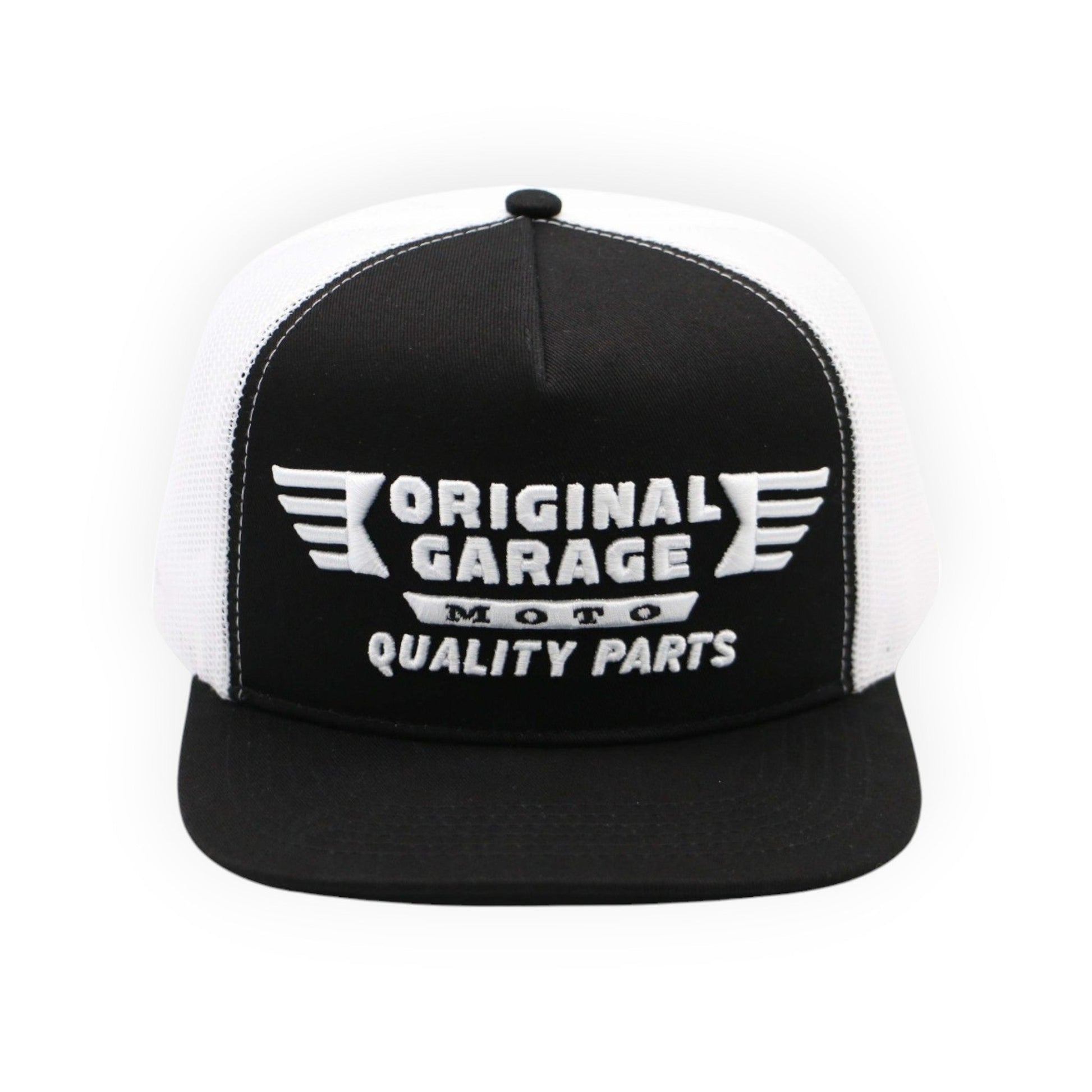 Adjustable 5-panel black trucker hat with a white mesh backing. Embroidered in white with our Quality Parts logo. Flat bill design. One size fits most.